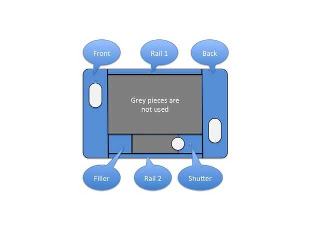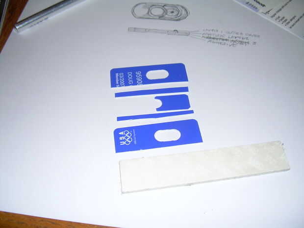 Este dibujo muestra las piezas básicas que es necesarias, como corte de una tarjeta de crédito de tamaño estándar, con un par de tijeras. Los agujeros de forma ovalados muestran la ubicación de la abertura. La mejor manera de asegurarse de que estos orificios se alineen, es primero cortar las piezas como se muestra. Luego apilar las piezas marcadas "Frente" y "Atrás" encima de la otra y taladre dos orificios (5/16" o 3/8") al lado de uno al otro. Luego utilice su cuchillo para cortar los agujeros para la forma ovalada que se muestra. Perfore el agujero para la persiana, antes de cortar ese pedazo, así no tienes que intentar cortar medio círculo con el cuchillo X-ACTO. Asegúrese de cortar el cierre y la pieza de relleno como cerca de la misma anchura como sea posible y como exactamente como sea posible, de modo que los carriles permitirá que el obturador se deslice suavemente.