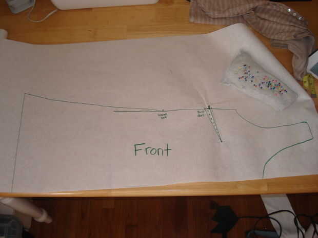 Doble la camisa mejor se ajusta a la mitad y colocar sobre el papel de patrón, emparejar los bordes de la doblez. Utilizando un marcador, trace alrededor del borde externo de su camisa, dejando una media pulgada de margen de costura y parando en el dardo del busto (si existe).