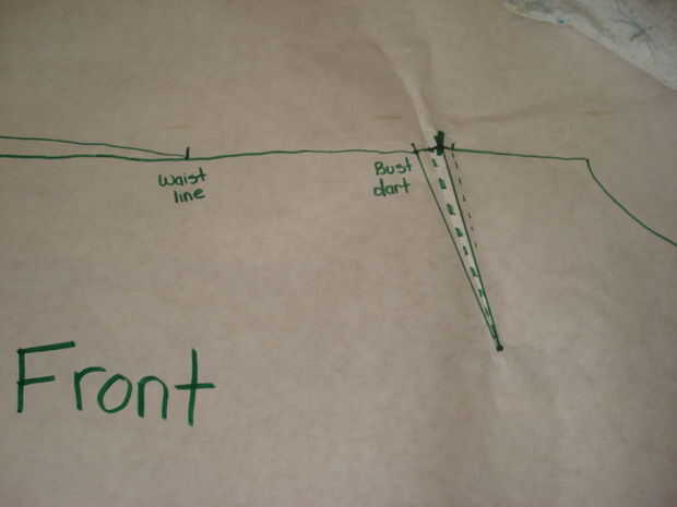 Liberar el dardo de busto en el papel. Trazar una línea desde el punto superior al punto final dart (uno cerca de la zona del pezón) y dibujar otra línea de fondo dart dart hasta el final.