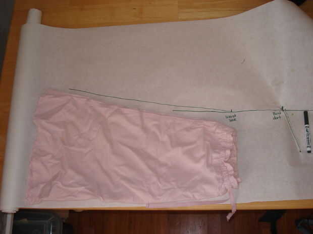 Mantener el patrón de busto cubrió (algo debo haber hecho!) y continuar el trazado por el borde de la camisa a la línea de cintura. Doble su mejor se ajusta una línea de falda por la mitad y colocar sobre el papel de patrón, emparejar los bordes de la doblez. Trace una línea alrededor del borde exterior y dobladillo inferior de su falda.