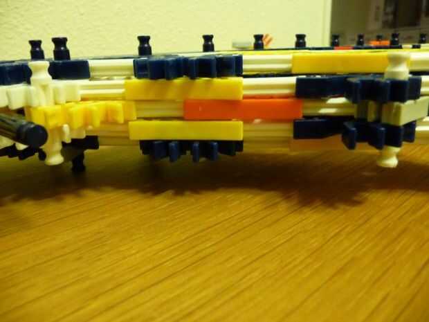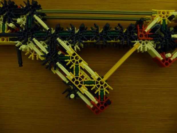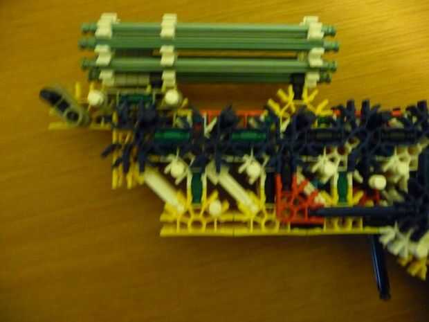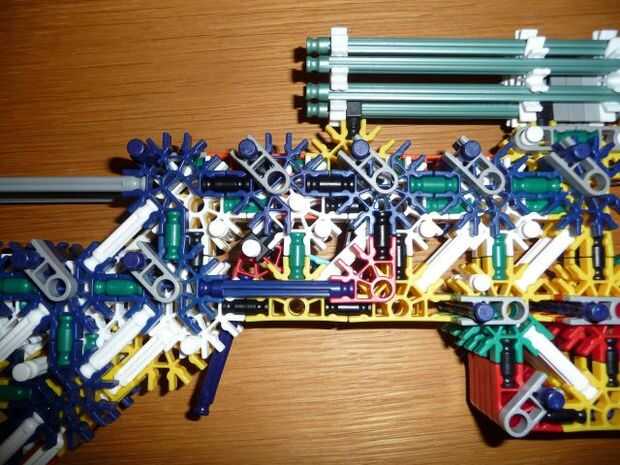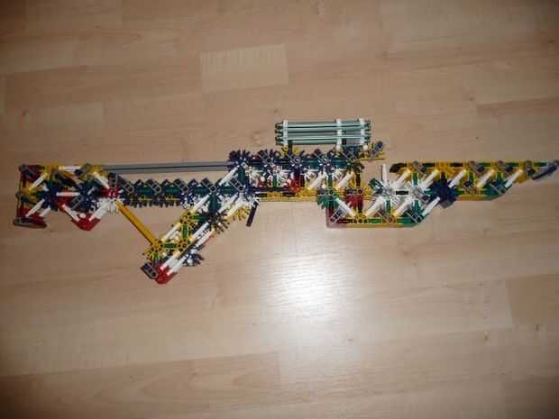 esta es el arma más poderosa de K'NEX creo que porque puede perforar 2 cerveza o COLA puede y destruir disco compacto fácilmente debido a la muy fuerte 4 gomas (yo uso 2 ligas diferentes) también incluye una gran revista para 5 K'NEX largo gris afila