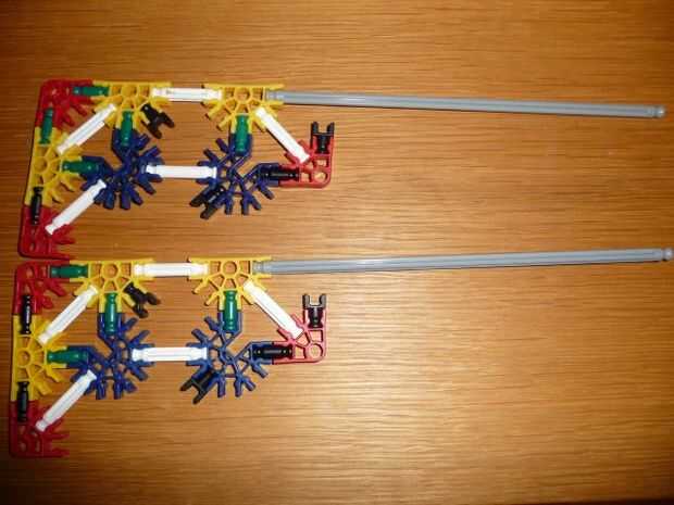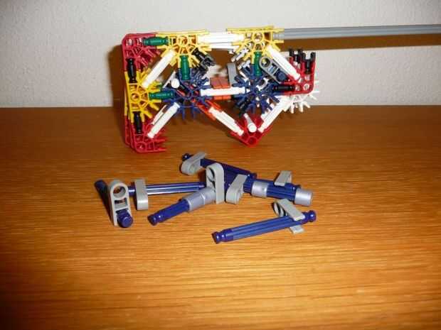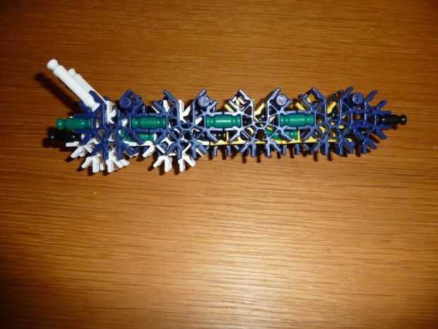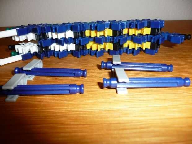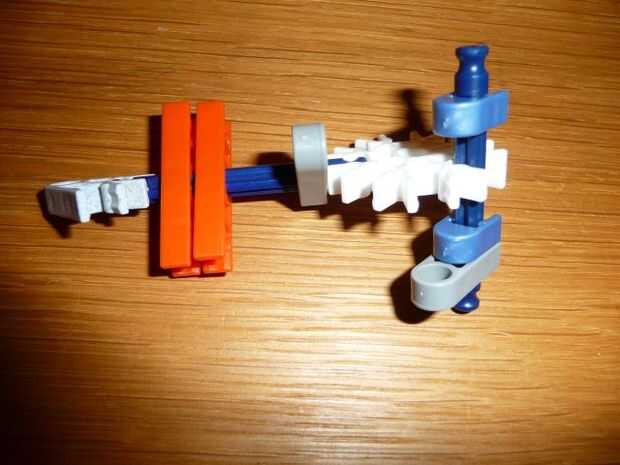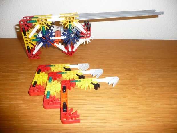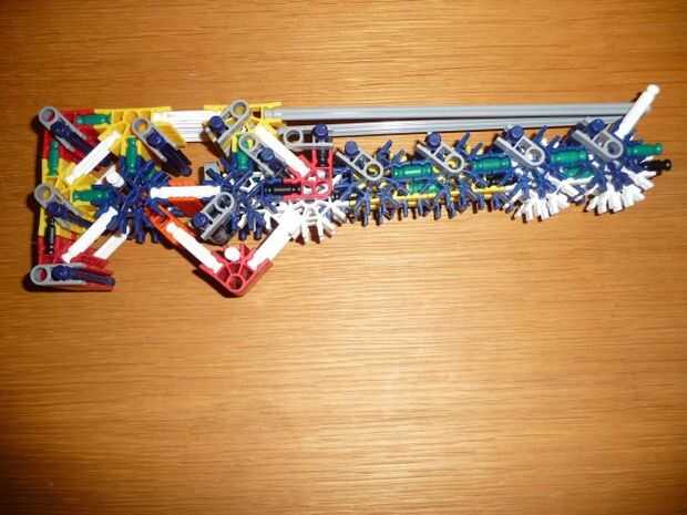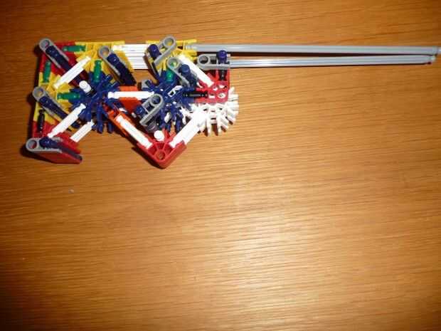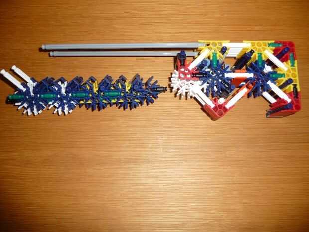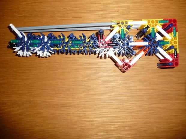 esta es el arma más poderosa de K'NEX creo que porque puede perforar 2 cerveza o COLA puede y destruir disco compacto fácilmente debido a la muy fuerte 4 gomas (yo uso 2 ligas diferentes) también incluye una gran revista para 5 K'NEX largo gris afila