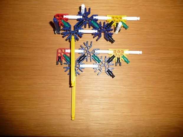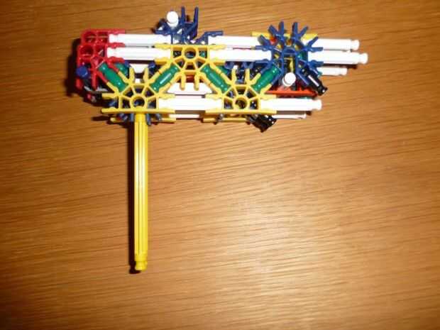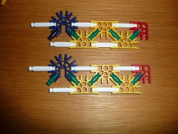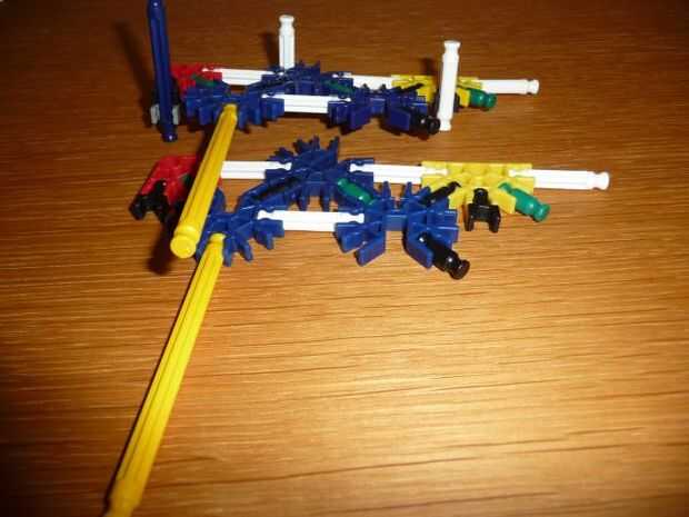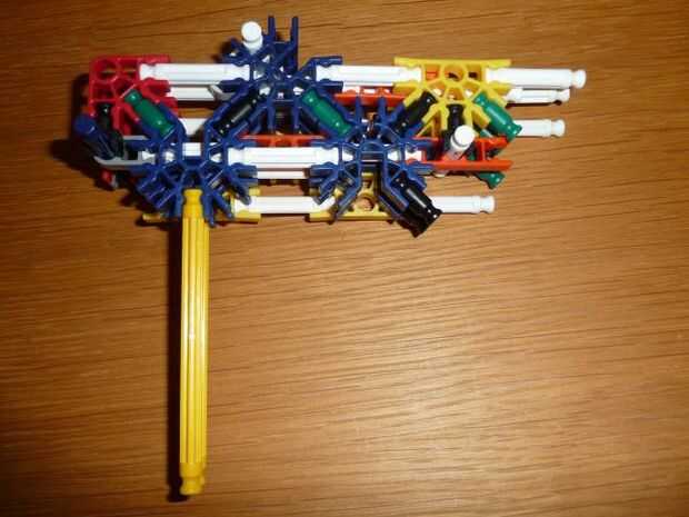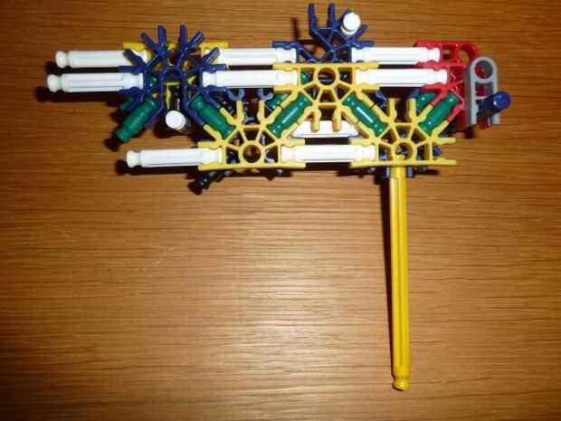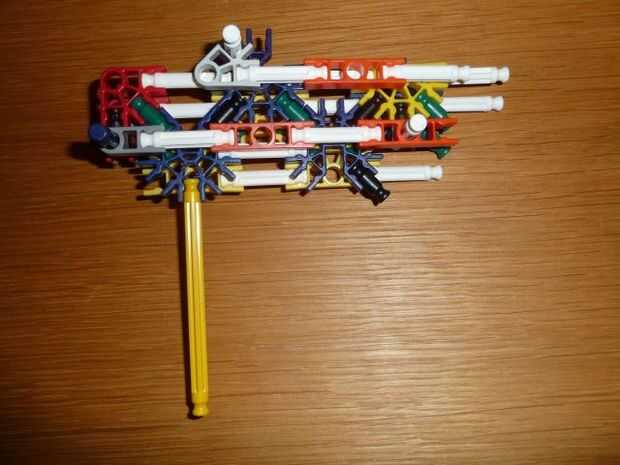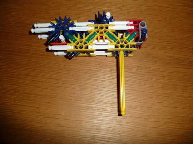 esta es el arma más poderosa de K'NEX creo que porque puede perforar 2 cerveza o COLA puede y destruir disco compacto fácilmente debido a la muy fuerte 4 gomas (yo uso 2 ligas diferentes) también incluye una gran revista para 5 K'NEX largo gris afila