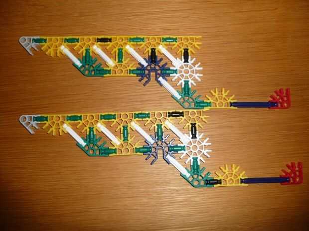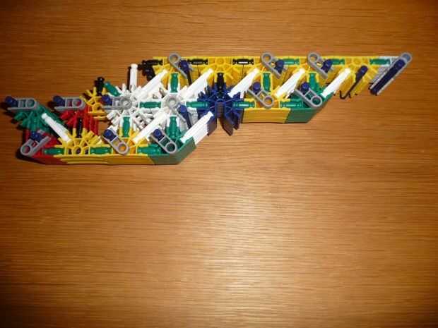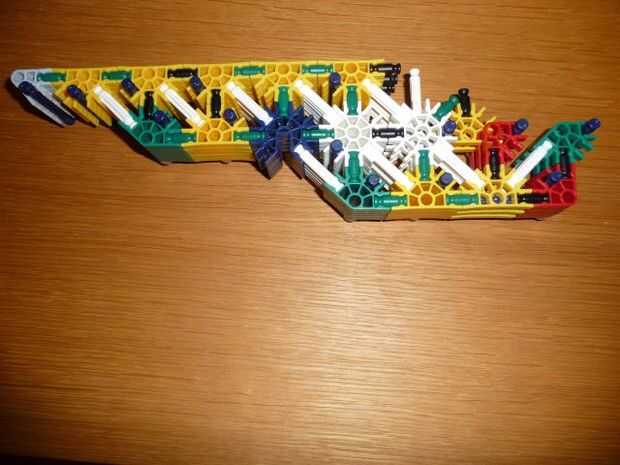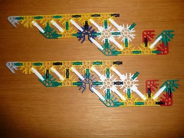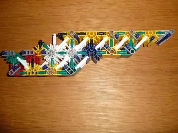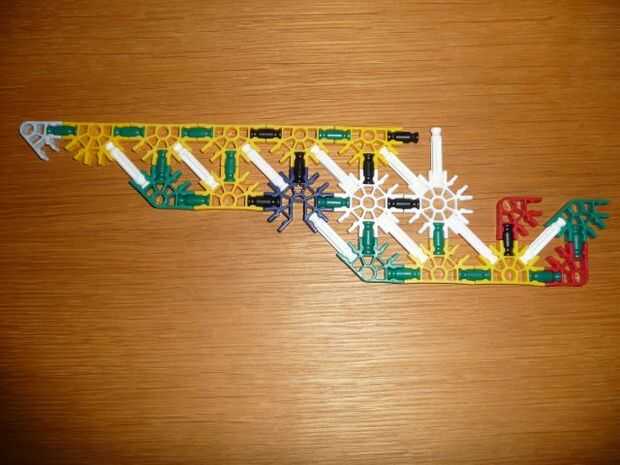 esta es el arma más poderosa de K'NEX creo que porque puede perforar 2 cerveza o COLA puede y destruir disco compacto fácilmente debido a la muy fuerte 4 gomas (yo uso 2 ligas diferentes) también incluye una gran revista para 5 K'NEX largo gris afila