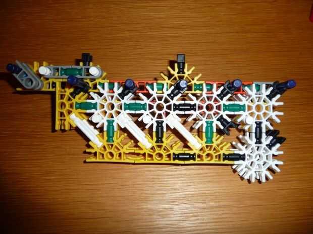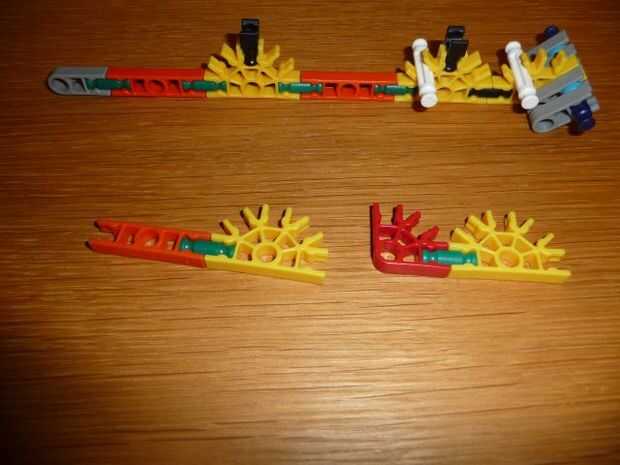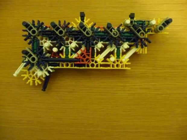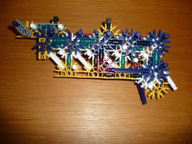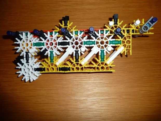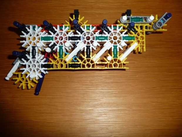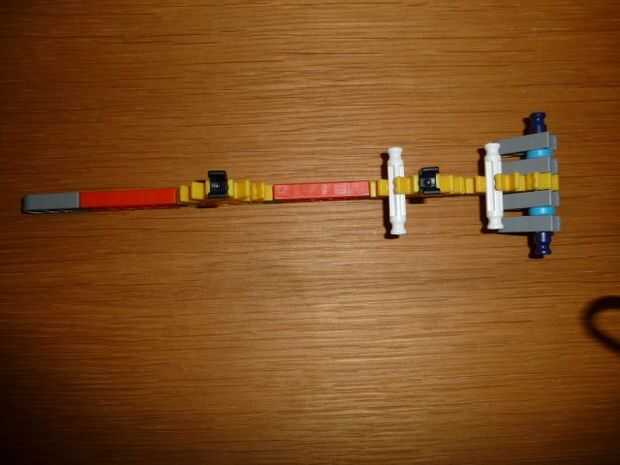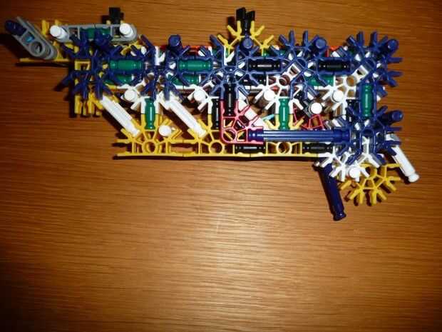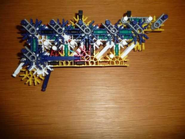 esta es el arma más poderosa de K'NEX creo que porque puede perforar 2 cerveza o COLA puede y destruir disco compacto fácilmente debido a la muy fuerte 4 gomas (yo uso 2 ligas diferentes) también incluye una gran revista para 5 K'NEX largo gris afila