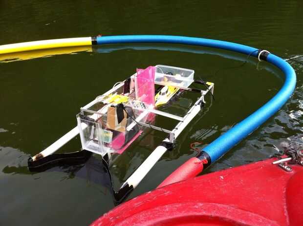 Nos estamos hackeando un robot de vela radio control para llevar una webcam eso registros video agua y partículas de plástico que aunque él. El plástico se recoge entonces con una red adjunta al final de los artilugios para comparar lo que estimamos de vídeo alimentación VS lo que recogemos realmente físicamente - por lo que podemos establecer la exactitud de nuestro sistema es (tolerancia). El prototipo actual es muy áspero pero confirma que es posible remotamente operar una plataforma compacta para capturar vídeo de partículas plásticas.