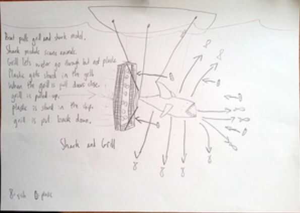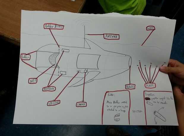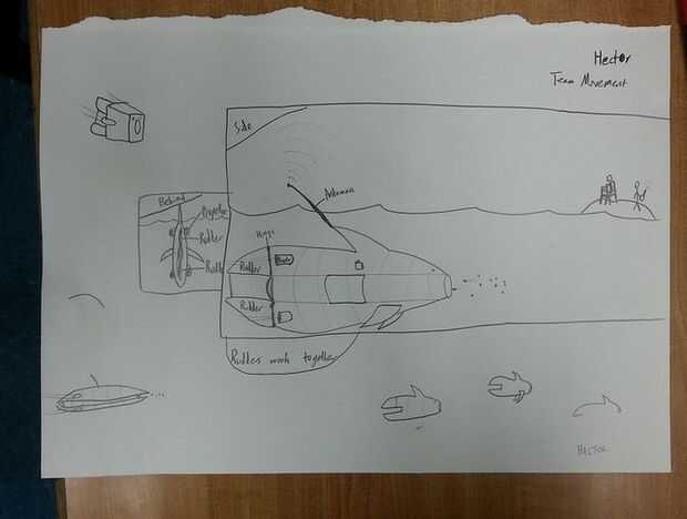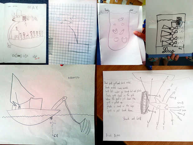 Héctor tenía un tiburón para ahuyentar a los peces y plancton para que no se registran. Riccardo tenía una caja de"matar" a todo lo que se acumula dentro de la caja matar. Después de eso, él recogerá el plástico que queda dentro. Otros diseños incluyen el robot pescado consumir el plástico, una red que parece un tubo cerrado en un extremo para recoger nada sólido, y una idea incluido plástico "adhesivos" atado a un bloque de acero adherirse al plástico y así haciéndolo más fácil de recoger. Para más inspiración y diseños de otros miembros del equipo, haga clic aquí.