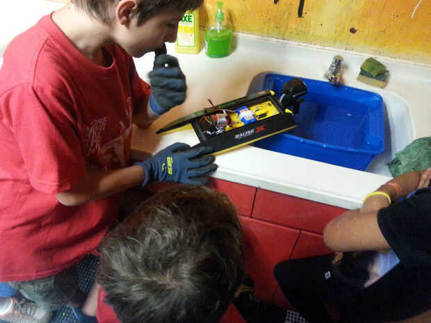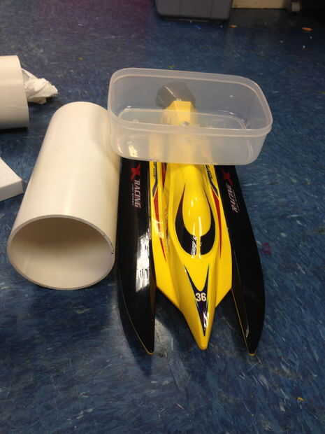 Hemos hackeado una pequeña lancha radio controlada. En primer lugar, tenemos que probar el sistema de seguridad de la embarcación. Si ha desconectado el interruptor eléctrico del agua, el barco debe deje de funcionar. La función de la embarcación es propulsar la máquina a través del agua.