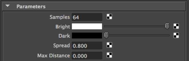 Mediante el aumento de las muestras, su procesamiento se verá menos ruidosos y granulada. Por la disminución de la propagación, su procesamiento se verá como si se aumenta el contraste. Incrementando la distancia Max entre 0.000 y cualquier valor distinto de cero Maya disminuirá hasta dónde se extienden las sombras. El valor 0.000 representa esencialmente infinito.