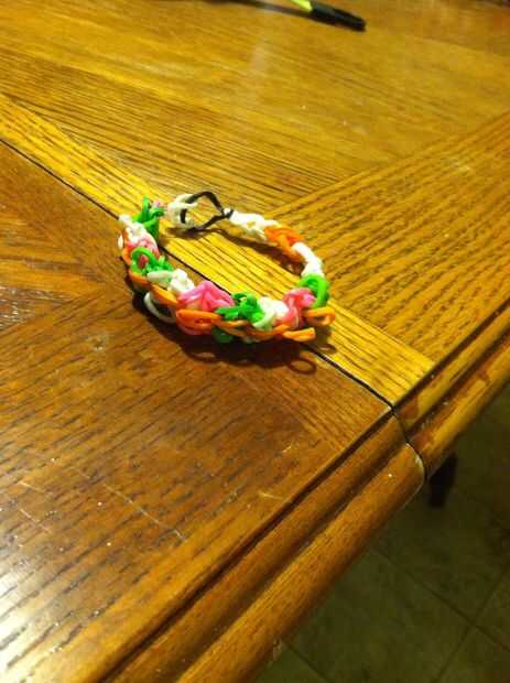 Ahora tire de los dos lados ninguno y ponga el gancho a través de todos ellos y conseguir otra goma y tire de ella a través de ahora tire de tu nueva pulsera Octa-flor!