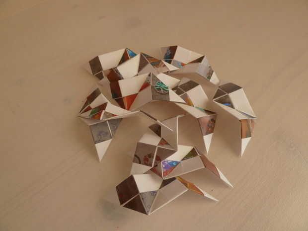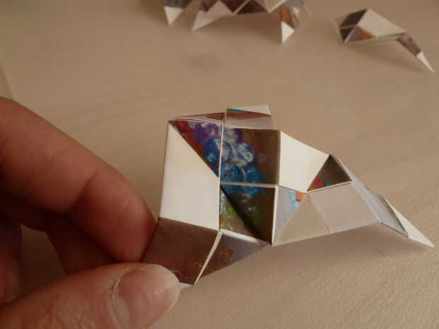 Primero descubrí la forma de octaedro estrellado cuando sólo al azar me conexión de módulos de cubos de origami. Cumplí esta forma en estos pequeños colgantes. Después de hacer esto, yo seguí doblando octaedros estrellados, simplemente porque me enca