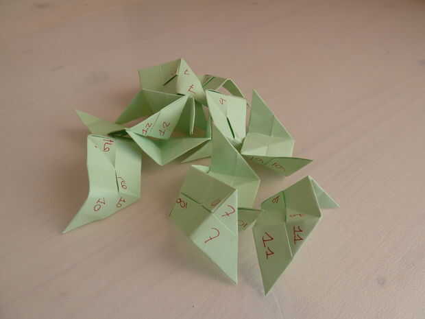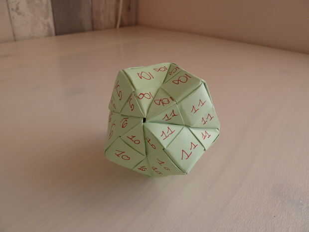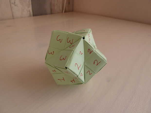 Después de agregar los números, tomé el octaedro estrellado doce desplegado todo aparte de las piezas. Utilicé estas piezas para crear el modelo, como se muestra en el paso 4.