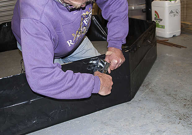 Utilizando una engrapadora con grapas cortas, engrape el plástico a la madera contrachapada.