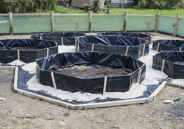 Las camas levantadas se acaban pero quería mostrar cómo ponemos en bordes, establecidas de la estera de la fatiga y llena un camino alrededor de la cama octogonal con las virutas de piedra caliza.