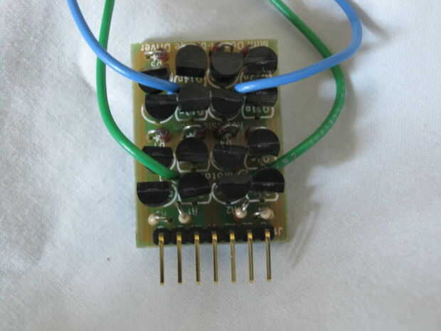 Arme el Mondo-tronics mini doble puente H según las instrucciones que vienen con ella o en la Página Web de Mondo-tronics.  Seleccioné este puente de H porque es compatible con dos motores de 3 voltios y es muy pequeña.  Verdes y cables azules al puente H que más tarde se conectarán a los motores de la soldadura. Los alambres verdes ir a uno de los motores y los cables azules al otro.