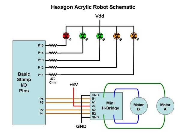 LEDs se utilizan para indicar lo que está haciendo el programa. El LED rojo se ilumina cuando el programa se está ejecutando, se iluminan del LED verde y el naranja cuando se emite una señal al puente H. En el siguiente diagrama se muestra un esquema.