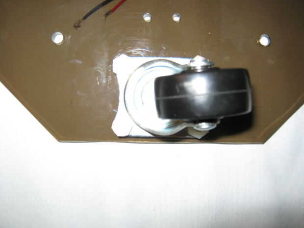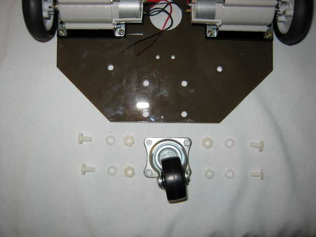 Montar las ruedas en la plataforma inferior usando los tornillos de nylon, arandelas y tuercas como se muestra en las fotos de abajo.  Utilizado piezas de nylon para ayudar a minimizar el peso del robot.