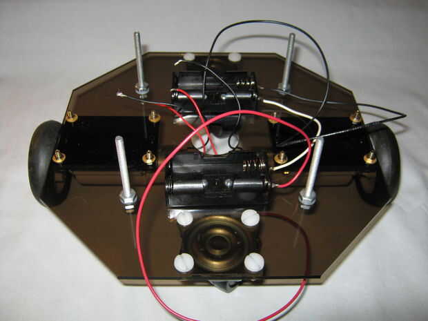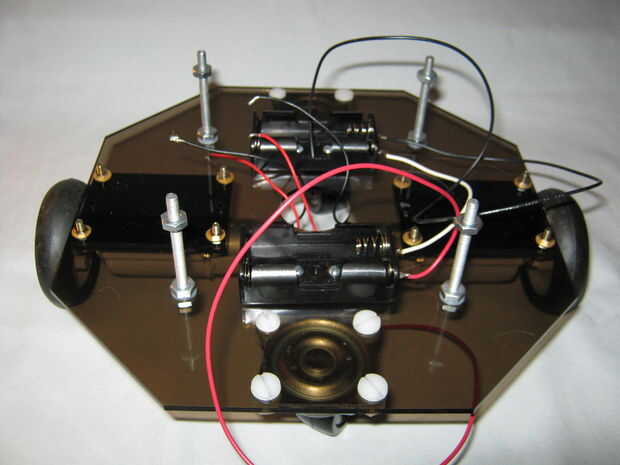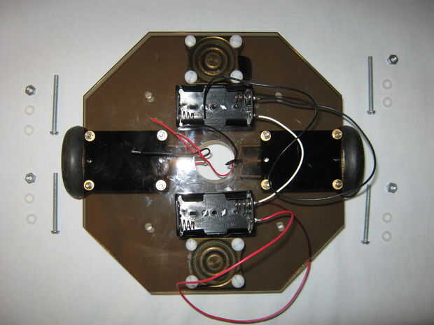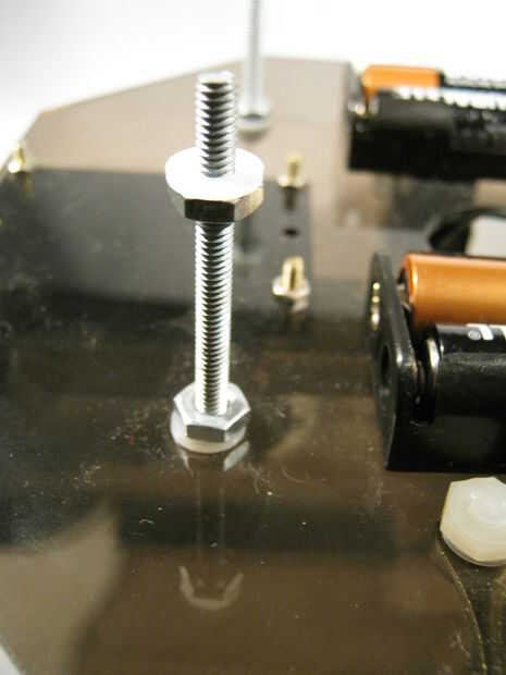 La plataforma superior es apoyada por cuatro pernos a la plataforma inferior como se muestra en las fotos de abajo.  Arandelas de nylon se utilizan para prevenir daños a la plataforma de acrílico que rasguña fácilmente. Consejos para el montaje están en las notas de la imagen.