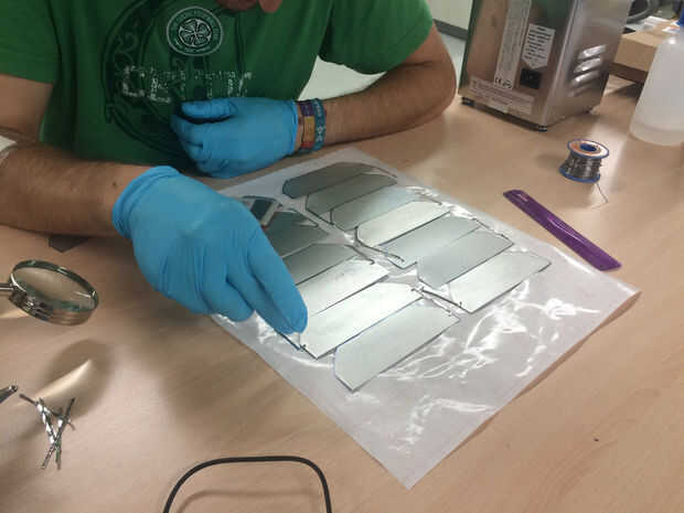Luego soldarlos con tabulación solar (conseguir en eBay). 1 Octanis utiliza un 7s2p (7 series, 2 URL) configuración. Soldar es sencillo, uso de la soldadura de estaño si es necesario. De soldadura mientras se suelda un PCB.
