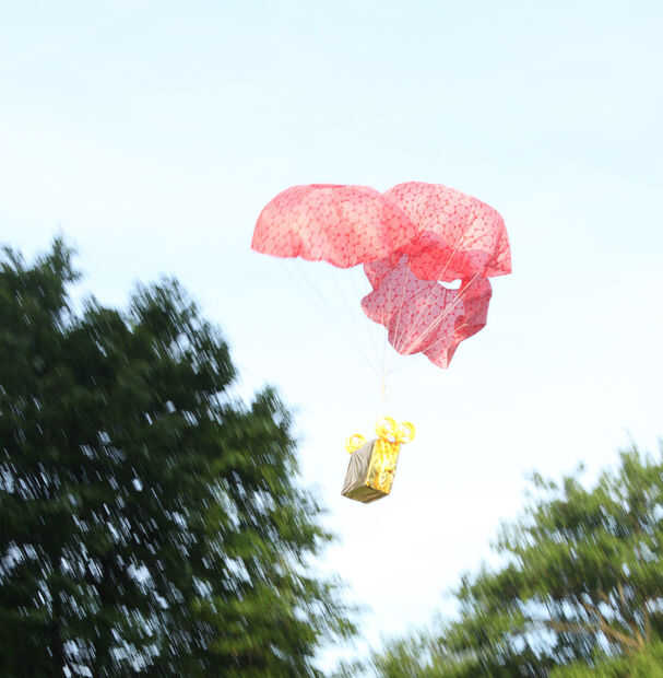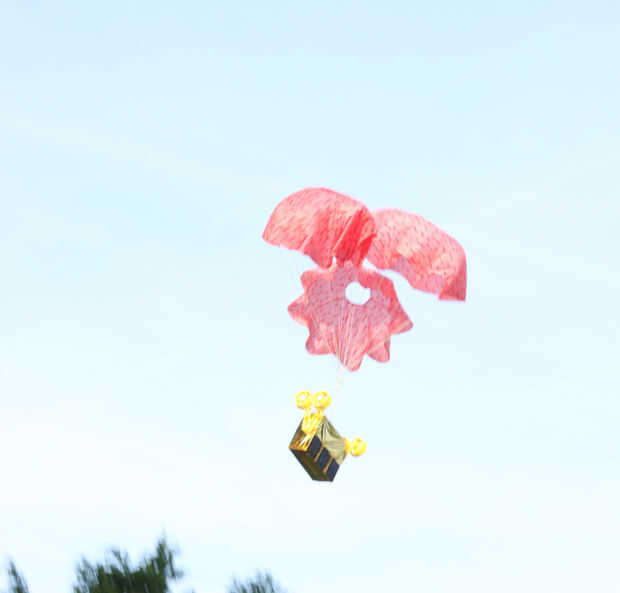 Pasos:1. construir un poste resistente en el centro del lugar del evento.2. proporcione abundante robusto cuerdas en conectar los bordes del paracaídas.3. Conecte todos conexión cables a un cercano estructuras como edificios, postes de concreto, etc.