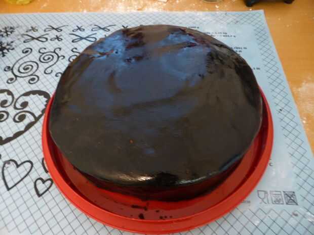 Cubrir el pastel con la hoja de pasta de azúcar y alisar hacia fuera con las manos. Use un cuchillo para cortar pasta excesiva.