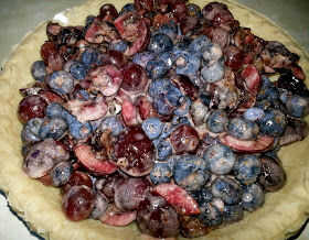 Esta torta es una mezcla de 3 tazas de congelados en cuartos de cerezas, arándanos y uvas. Agregué 1/4 taza polvo de arrurruz (usted puede utilizar polvo de fécula de maíz en lugar de otro), 1/2 taza de azúcar y 1 cucharadas nuez moscada.