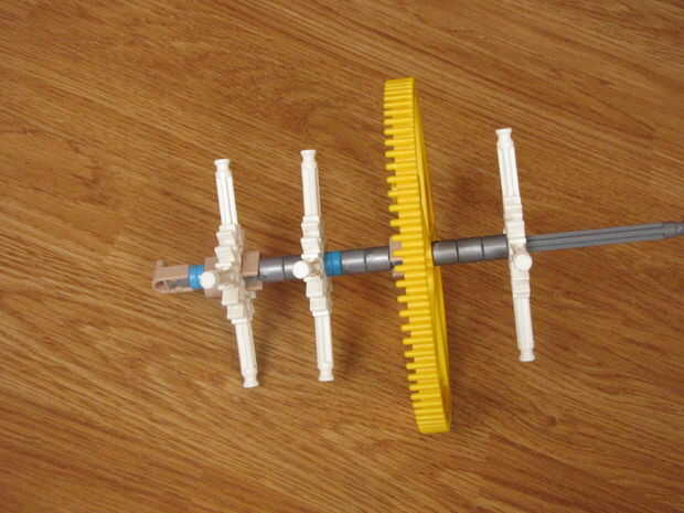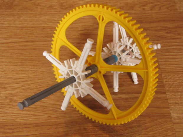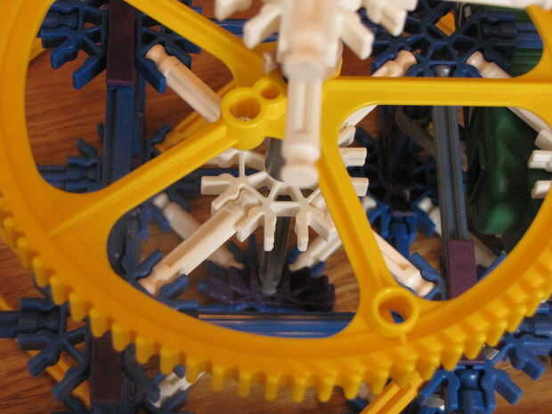 ¡ Mira! Un engranaje amarillo grande! ¿Qué haremos con él? Poner en la base y construir más base!