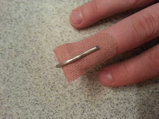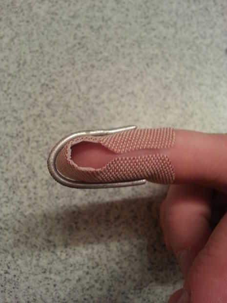 Comenzar con una tira de alambre de aluminio aproximadamente 5 pulgadas de largo. Doblar el alambre alrededor de un dedo diferente para obtener la forma general. A continuación coloque el cable de la curva sobre el dedo lesionado y marcar donde hay que cortar las tiras. Corte el alambre a la longitud deseada (fui hasta mi primera curva en mi dedo).