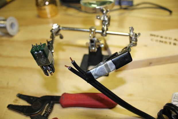 Usé tres tamaños del tubo del encogimiento que tenía puesta alrededor. Su selección puede variar. Lo que queremos hacer es proporcionar algunos separación eléctrica y alivio de tensión para los cables y terminales.