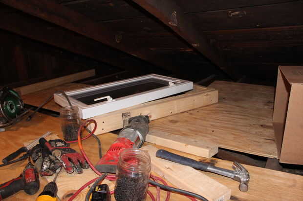 Cortar el exterior de la casa, cierren la ventana en su lugar, poner cinta de sello de tiempo en el exterior y más tarde este año, estará poniendo el cedro en la parte exterior de esta sección de la casa. Nunca fue a un lado antes, sólo tenía papel alquitranado en él. como un pequeño triangular jut hacia fuera conduce a un techo plano. Con la azotea fuera, mi hijo por lo menos puede subirse sobre algo y saltar 8 pies en el suelo o en brazos si es necesario.