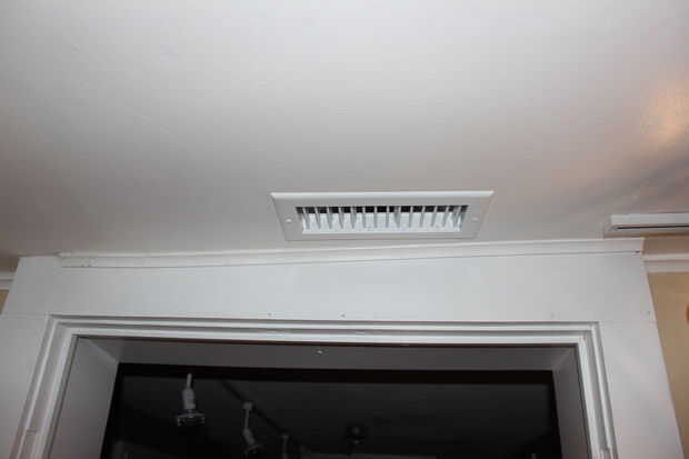 Cortar un agujero en el techo por el borde de la sala, corrió el conducto y el ventilador y había instalado una cubierta blanca en el techo del comedor.