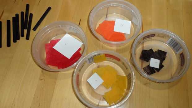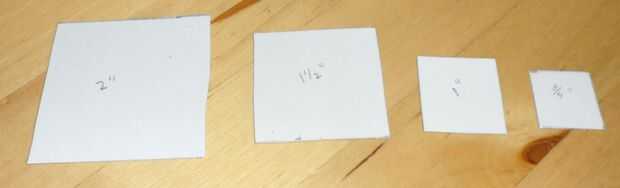 Cortar plantillas de Junta de cartel cuadrado 1", 1 1/2" y 2". Use estas plantillas para cortar tejido rojo (2"), amarillo (1") y naranja (1 1/2") plazas por las llamas.
