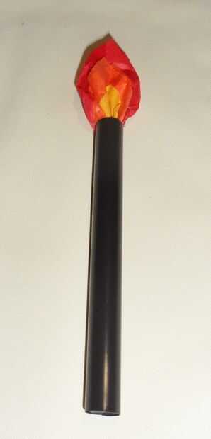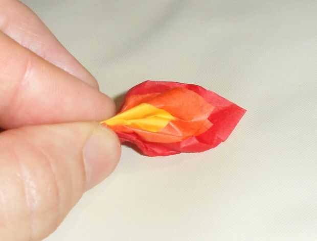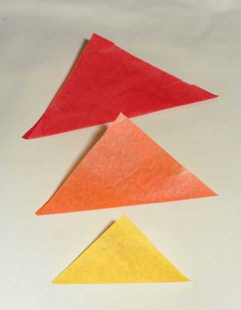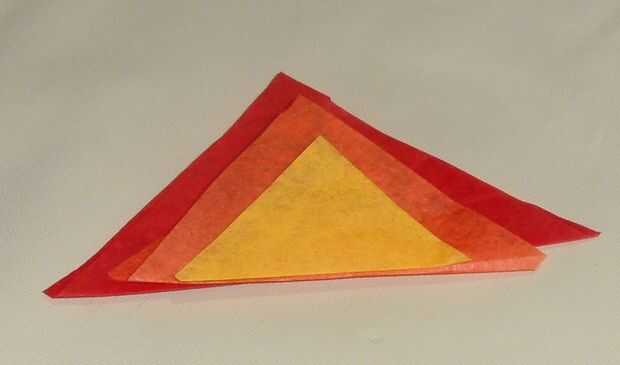 Doble plazas tejido por la mitad diagonalmente. Coloque un triángulo de tejido amarillo en la parte superior un triángulo de tejido naranja en la parte superior un triángulo rojo. A partir de los pliegues del centro juntos. Usando un palillo de dientes, aplicar pegamento en el interior superior borde de paja vela y coloque la llama tejido.