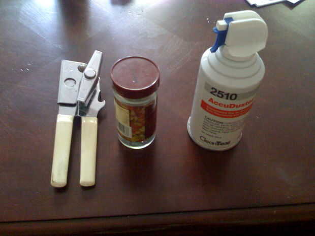 Recoger en primer lugar, todos los suministros necesarios... -El AccuDuster (o lo que tengas) -Pistola de pegamento caliente -Papel higiénico rollo -Vidrio puede o tapa de rosca puede (nada encaja en el Accuduster) -Abrelatas