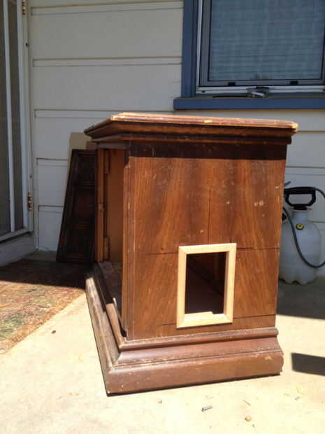 Corte la abertura para la entrada y adornado con "L" en forma de moldura para fines estéticos. Si no desea utilizar trim, asegúrese de lijar los bordes para evitar heridas en los gatos. También corte una abertura en la parte posterior para ventilación, ataremos una rejilla de ventilación sobre esta abertura con doble cinta adhesiva resistente.