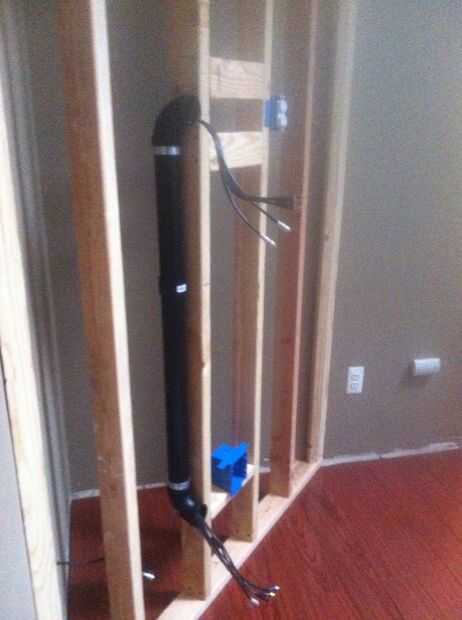 Después de enmarcar TV pared corta tubo de pvc a la longitud deseada. usted necesitará 2 codos de 90 grados calman los cables se deslice agradable y fácil a través de la pared. Abrazaderas para tubos de uso para asegurar a la estructura