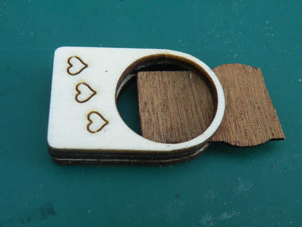 La chapa, siendo capas fino y único, es sensible a la temperatura y humedad - tan pronto como se agregue el pegamento, la pieza en forma de U de chapa comenzará a abrir o cerrar ligeramente, dependiendo de exactamente qué partes se hinchan primero. Las corté las piezas tienden a cerrar, que es un problema porque el boquete llega a ser demasiado pequeño para la tarjeta de memoria. Necesita para fijar las piezas rápidamente y firmemente dejar la chapa deslizante en las direcciones que podrían causar problemas.
