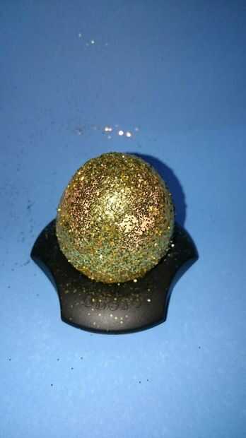 Si utilizas brillo, igual para el que está en la imagen, recomienda el uso de pegamento comestible para cubrir el huevo y luego rodar en brillo comestible... Puesto que brillo tiene la tendencia a estar en todas partes, una vez que decidido a usarlo...