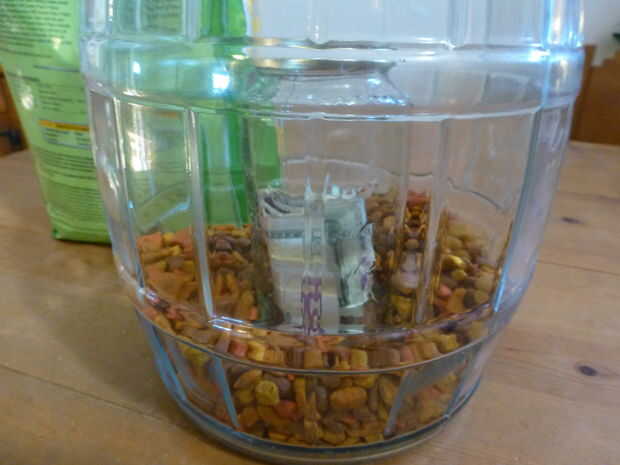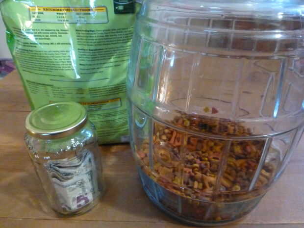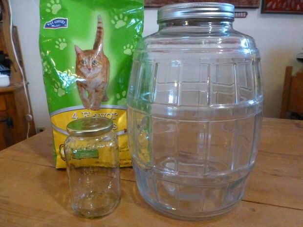 Esto es una 'hacia fuera en el abierto' de la piel en los fideos o frijoles en la cocina yo idea. Todo lo que necesita es un contenedor, lo suficientemente grande para un alimento más pequeño envase y perro o gato. Casualidad que un frasco de vidrio que uso en la cocina y ver cuándo está agotando pero podría usar cualquier envase de almacenaje.