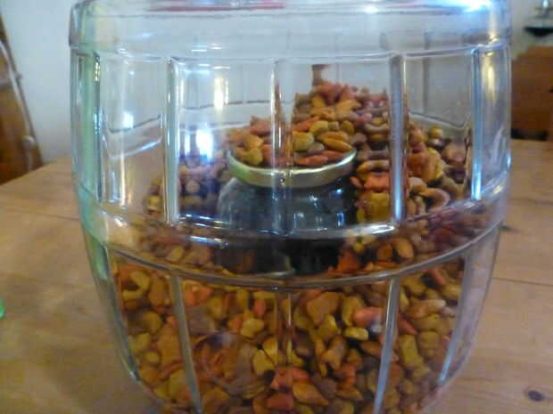 Poner un poco de la comida en la parte inferior de la jarra. Lo suficiente como para amortiguar la jarra de hidie. Lugar uno más pequeño en el centro del recipiente más grande.