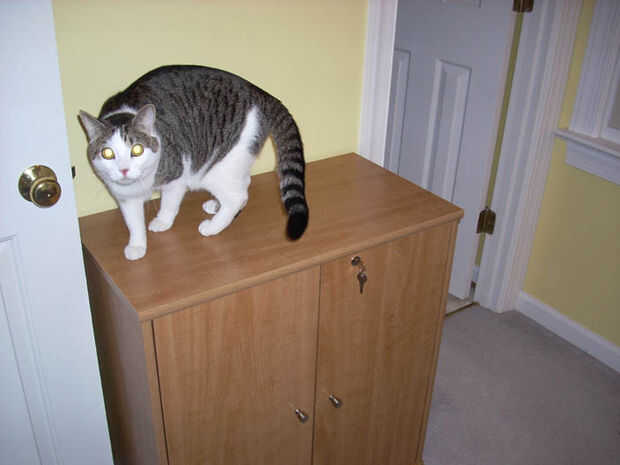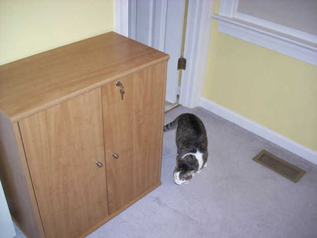 Tenemos un gabinete cerraduras. Esto es útil porque evita que los gatos que salen al frente y arena sobrante en el piso. Si su gabinete no se traba, Traba armario bebé funciona bien.