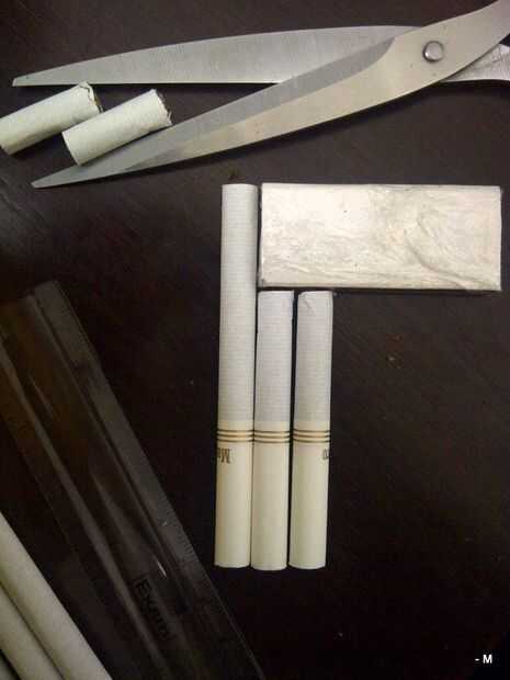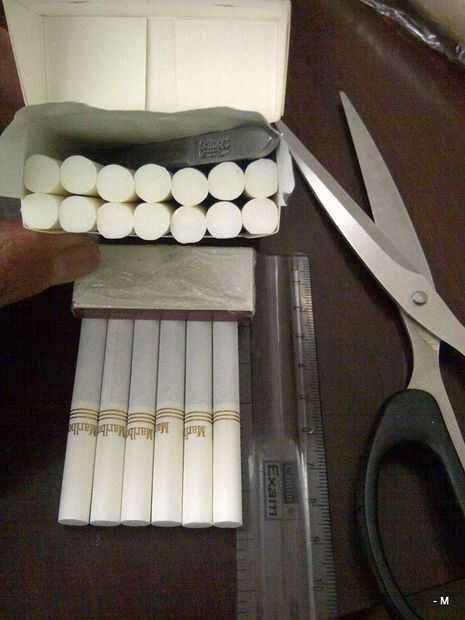Corte seis o siete cigarrillos de la última fila (según el embalaje del fabricante) menos el ancho de la caja secreta como se muestra en la imagen.