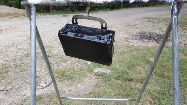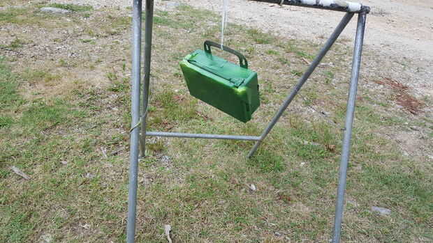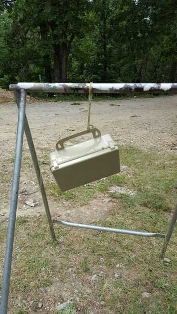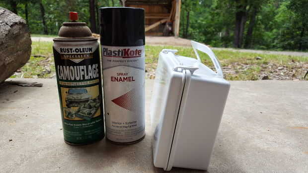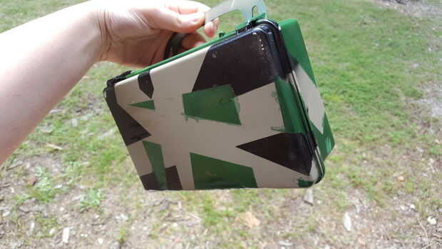 En primer lugar, tienes que camuflar su caja de almacenaje lejos de ocultar. El cuadro que estoy usando es un botiquín de autobús de la vieja escuela, pero cualquier envase herméticamente sellado o caja funcionará. Tienes que pintar el exterior de la caja con marrones, verdes y negros para que se mezcla con colores exteriores.