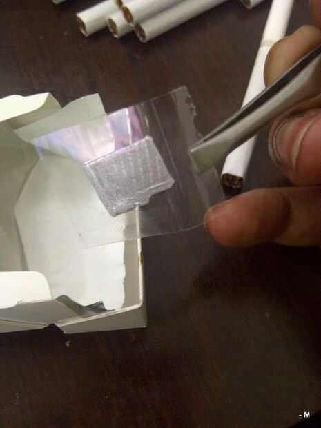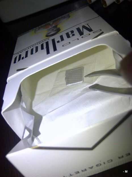 Ocultar objetos delgados como sim, tarjetas memoria, dentro de una caja de cigarrillos