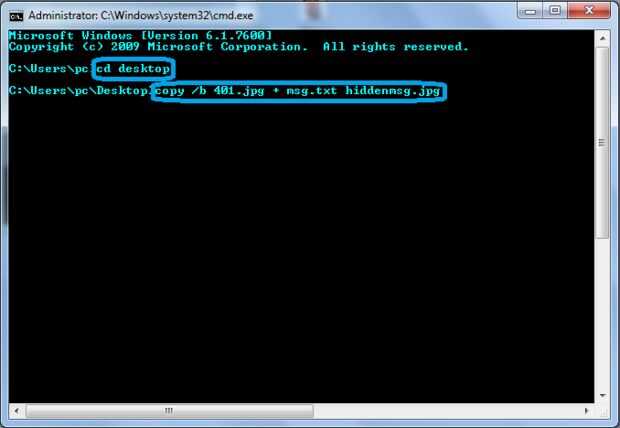 Escriba copiar/b 401. jpg + msg.txt hiddenmsg.jpg luego entrar.