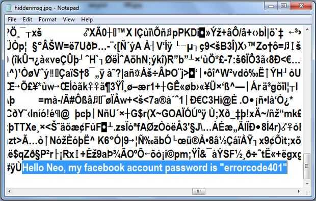 Cuando quieras ver su mensaje que está oculto en la imagen luego abrir el archivo de imagen nuevo [hiddenmsg.jpg] con bloc de notas.