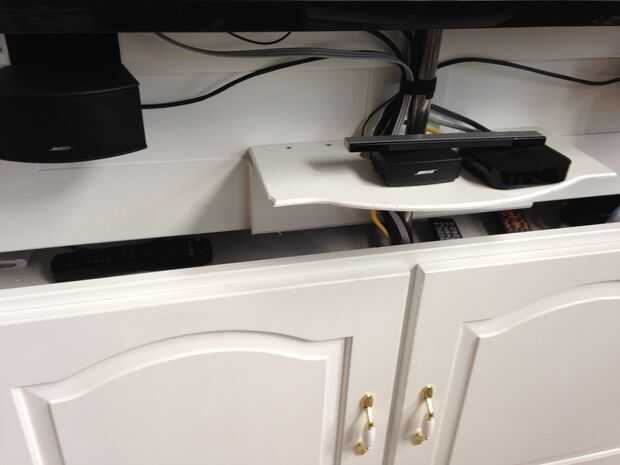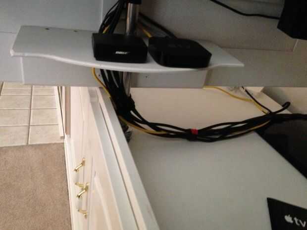 También monta mis altavoces en el tablero de soporte debajo de la TV y colocar el receptor en el estante con el Apple TV.