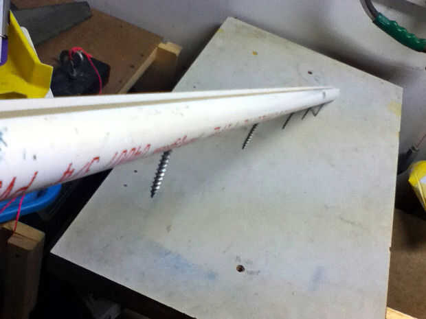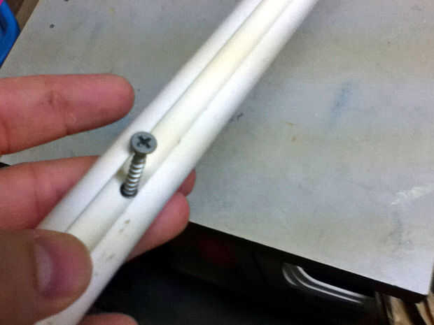 Ahora tenemos que perforar algunos agujeros para los tornillos que se fije el tubo a la pared.  Puedes ver la raja limpiarla corte en la tubería.  Taladré orificios aproximadamente cada 8 pulgadas.  Su kilometraje mi vary.