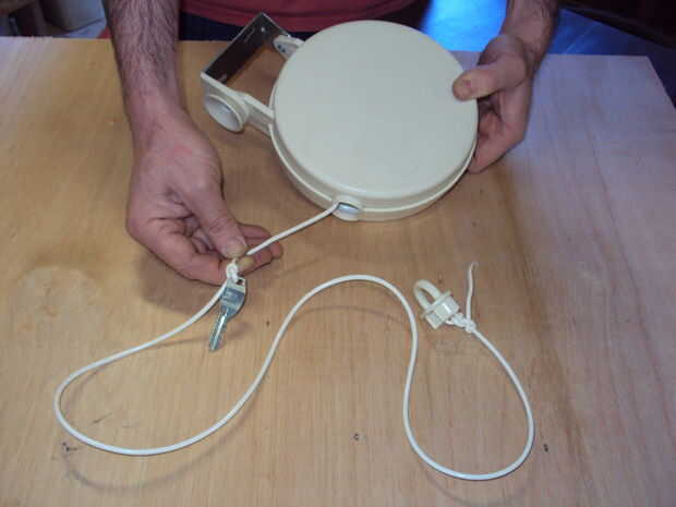 Quería algo retráctil como mi conserje de la escuela primaria tenía para su enorme taco de llaves. ¿... Un tendedero retráctil? ¿Por qué utilizarlo en el lugar de escondite demasiado?