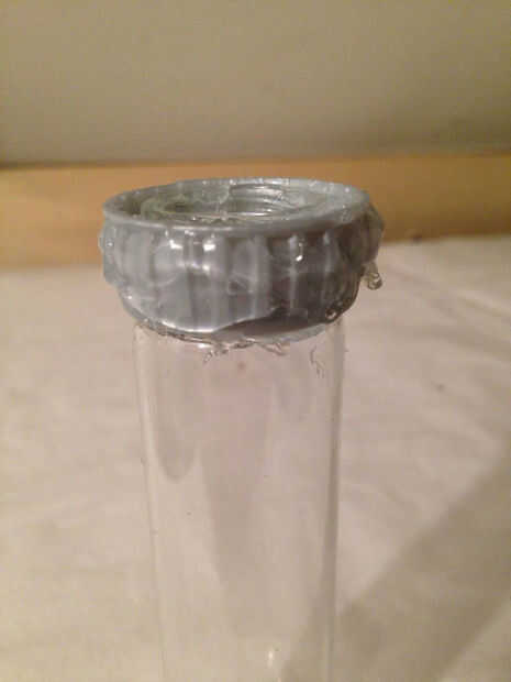 Una vez que el pegamento esté seco suficiente aplicar E6000 más hacia el exterior del tubo. Es probablemente una buena idea utilizar una saludable cantidad de pegamento. Usted quiere hacer un sello completo por lo que será a prueba de agua. Puede utilizar la misma técnica que antes de poner el dedo en el tubo antes de colocar en la botella. Tenga cuidado de pegamento se exuda de la parte superior, estar preparado para esto Asegúrese de tener algo para limpiar el pegamento con, no estaba preparado y terminó usando mis dedos para sacartelo. El tubo debe ser estable dentro así que no tienes que poner cualquier cosa para retenerlo. Otra vez dejando la configuración durante la noche es una buena idea.